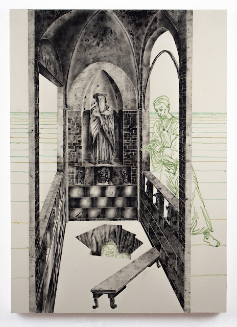 S-BT: I like it very much, I found this very captivating. I'm also coming from an orthodox country, and I am a bit familiar with the theology of icons. I also had the occasion to restore some very old and valuable religious frescoes in Romania. Some years ago I visited a few museums and churches in St. Petersburg and Novgorod, lucky enough to be very close to some great icons; I like this assumption because it relates to a general definition of any art object, a magical item you can touch, feel and see. In Western thinking we somewhat separate the image from its physicality, thus it turns out to be just a concept. I like the connection one can draw between the idea of a soul, regardless of religious dogma. In my opinion body and soul (if one agrees with it) are parts of the same whole and actually you can't separate them because they are constantly determining one another. In the same way, I can't really isolate concept from material dimension in a piece of art, even including conceptual art. When you are drawing or painting you use concepts in whatever way, it's almost naive to think otherwise. I also noticed you take some references from the early Renaissance, a solitary, austere background, architectural elements and geometric structures.